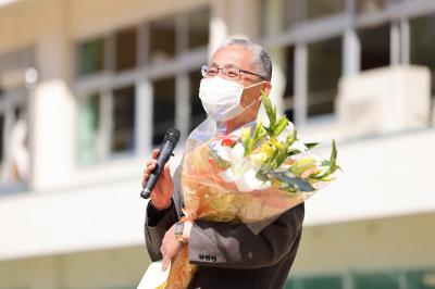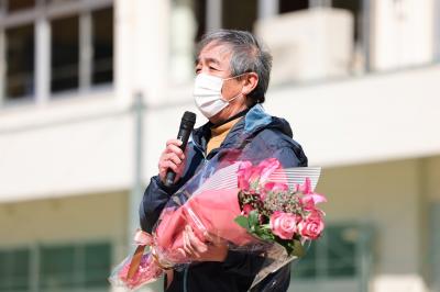 今年度で定年退職を迎える3名の先生方へ、全校生徒からメッセージ動画と花束が贈られました。